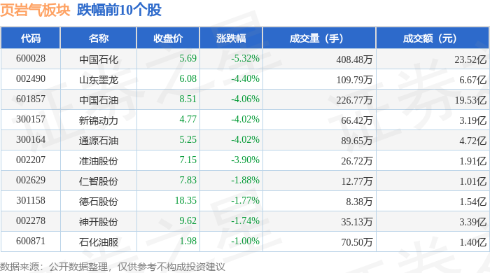 本站消息专业股票配资开户,8月1日页岩气板块较上一交易日下跌3.97%,中国石化领跌。当日上证指数报收于3559.95,下跌0.37%。深证成指报收于10991.32,下跌0.17%。页岩气板块个股涨跌见下表: