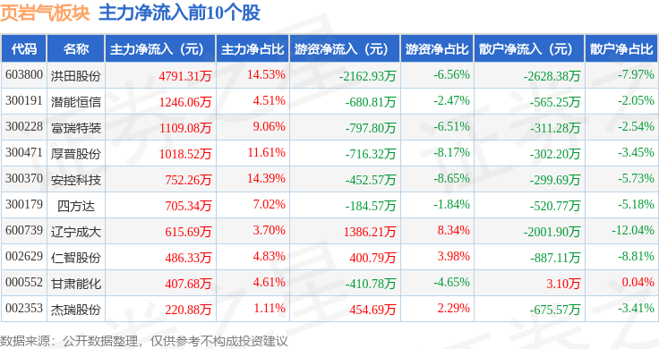 从资金流向上来看,当日页岩气板块主力资金净流出4.41亿元,游资资金净流入2.38亿元,散户资金净流入2.03亿元。页岩气板块个股资金流向见下表: