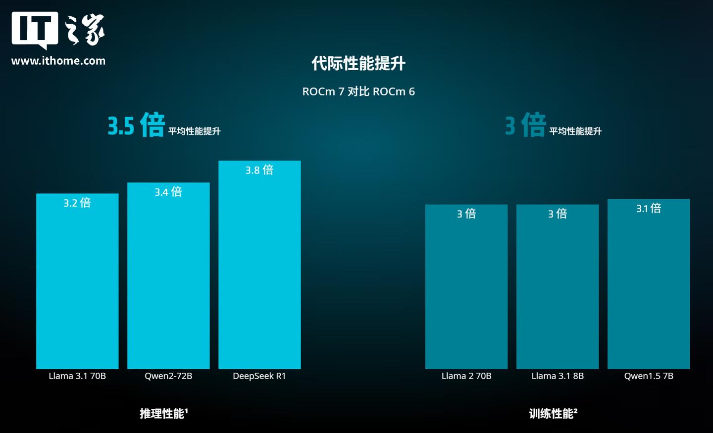 AMD 还提供了 ROCm7 的实测结果,相比较 ROCm 6,在 Llama 3.1 70B 模型上性能提升 3.2 倍,Qwen2-72B 上性能提升 3.4 倍,而 DeepSeek R1 性能提升 3.8 倍。